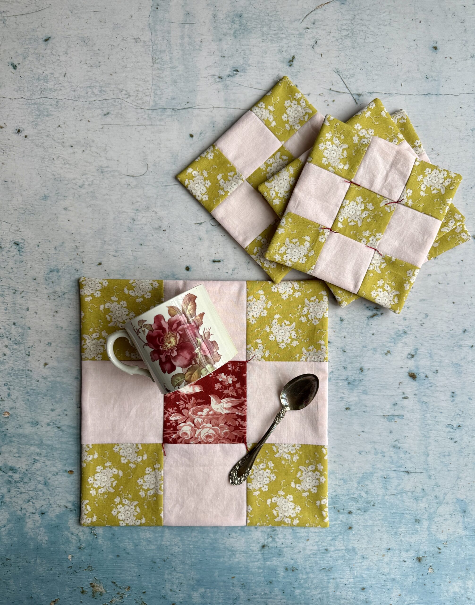 We’re putting away the machines and slowing down to learn the timeless art of hand-piecing. We will be hand sewing the classic Nine Patch block—the foundation of our Heirloom Tea Set.