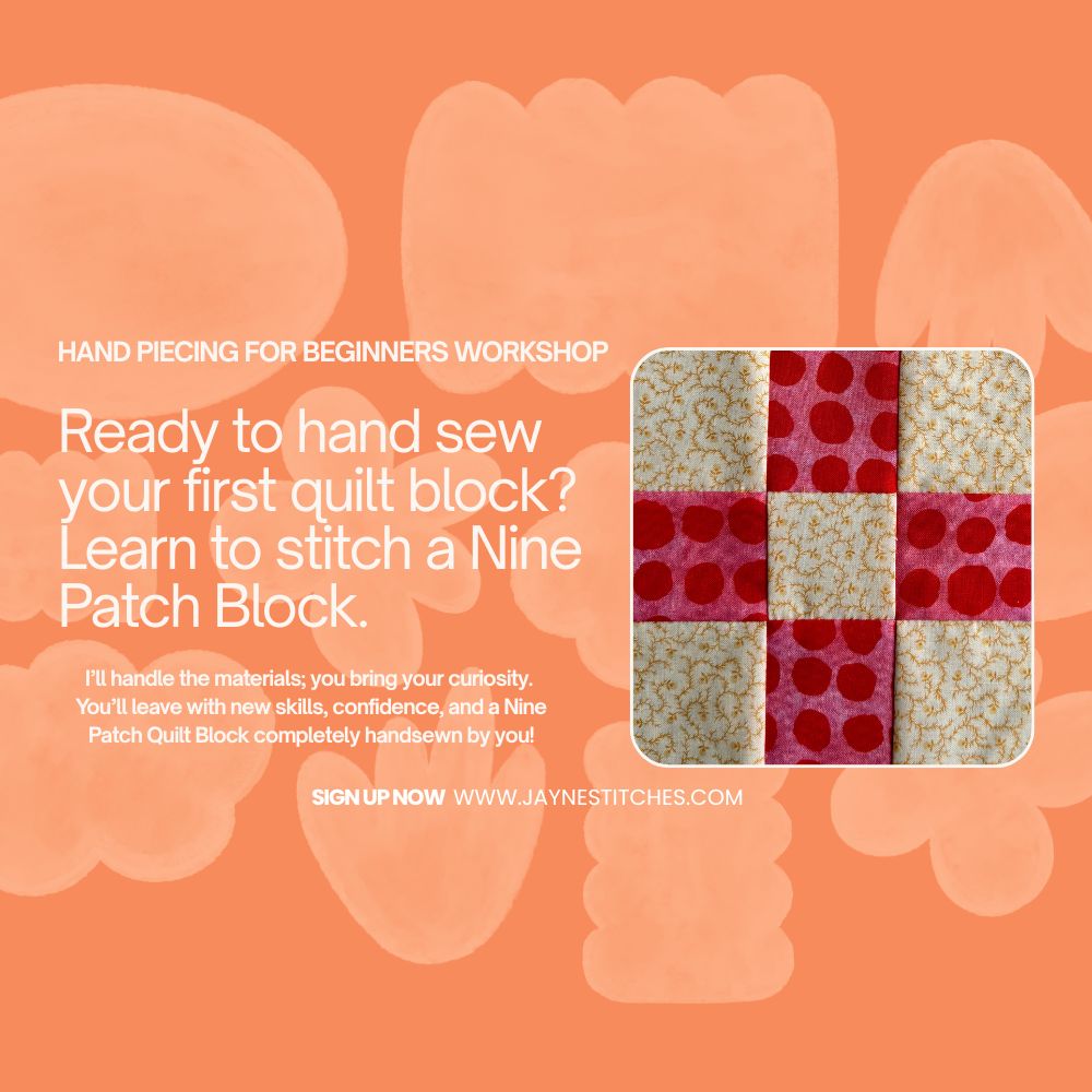 The Beginner Hand Piecing Nine Patch Workshop is a welcoming, in-person class designed for anyone curious about hand sewing quilt blocks. You’ll walk away with foundational skills, a completed nine patch block, and the confidence to start your own quilting projects — no experience required.