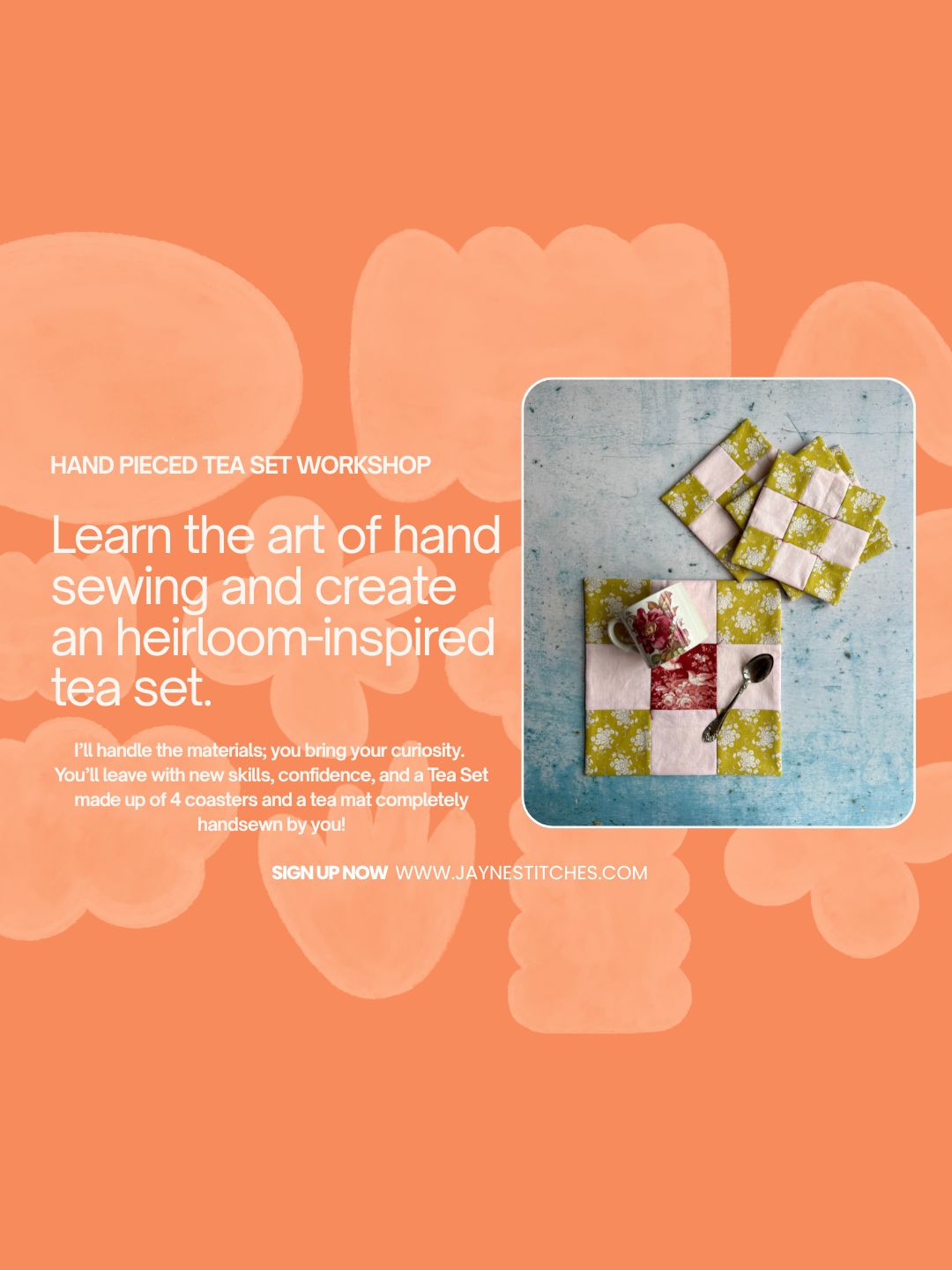 The Beginner Hand Piecing Tea Set Workshop is a welcoming, in-person class designed for anyone curious about hand sewing a quilt block based project. You’ll walk away with foundational skills, a completed Tea Set that included 4 Coasters and a Tea Mat, and the confidence to start your own quilting projects — no experience required.