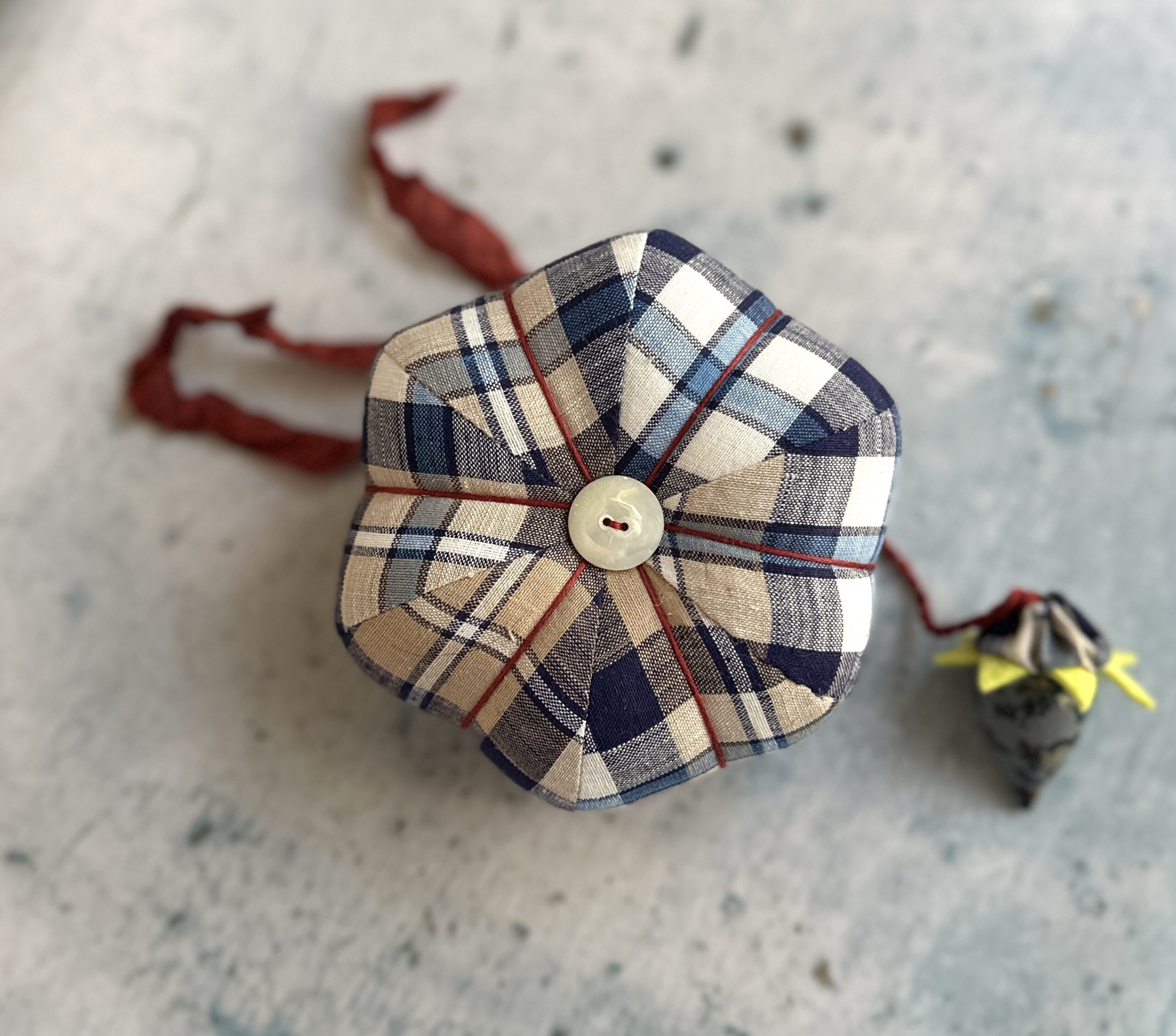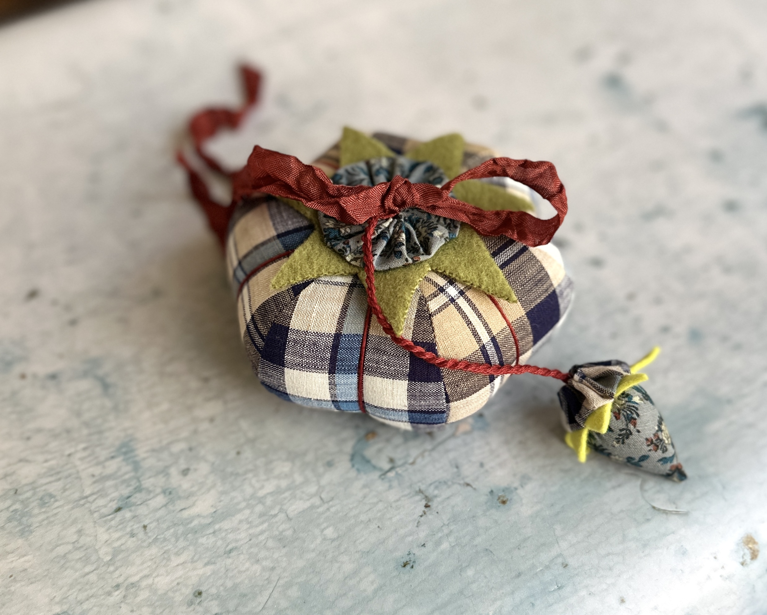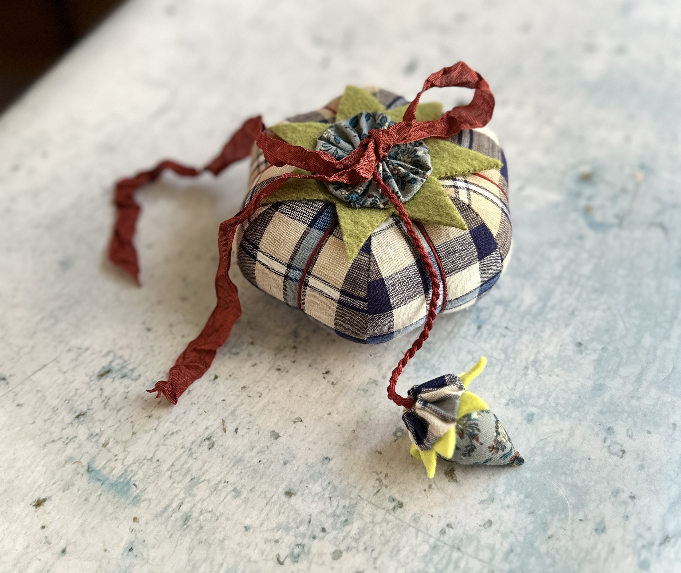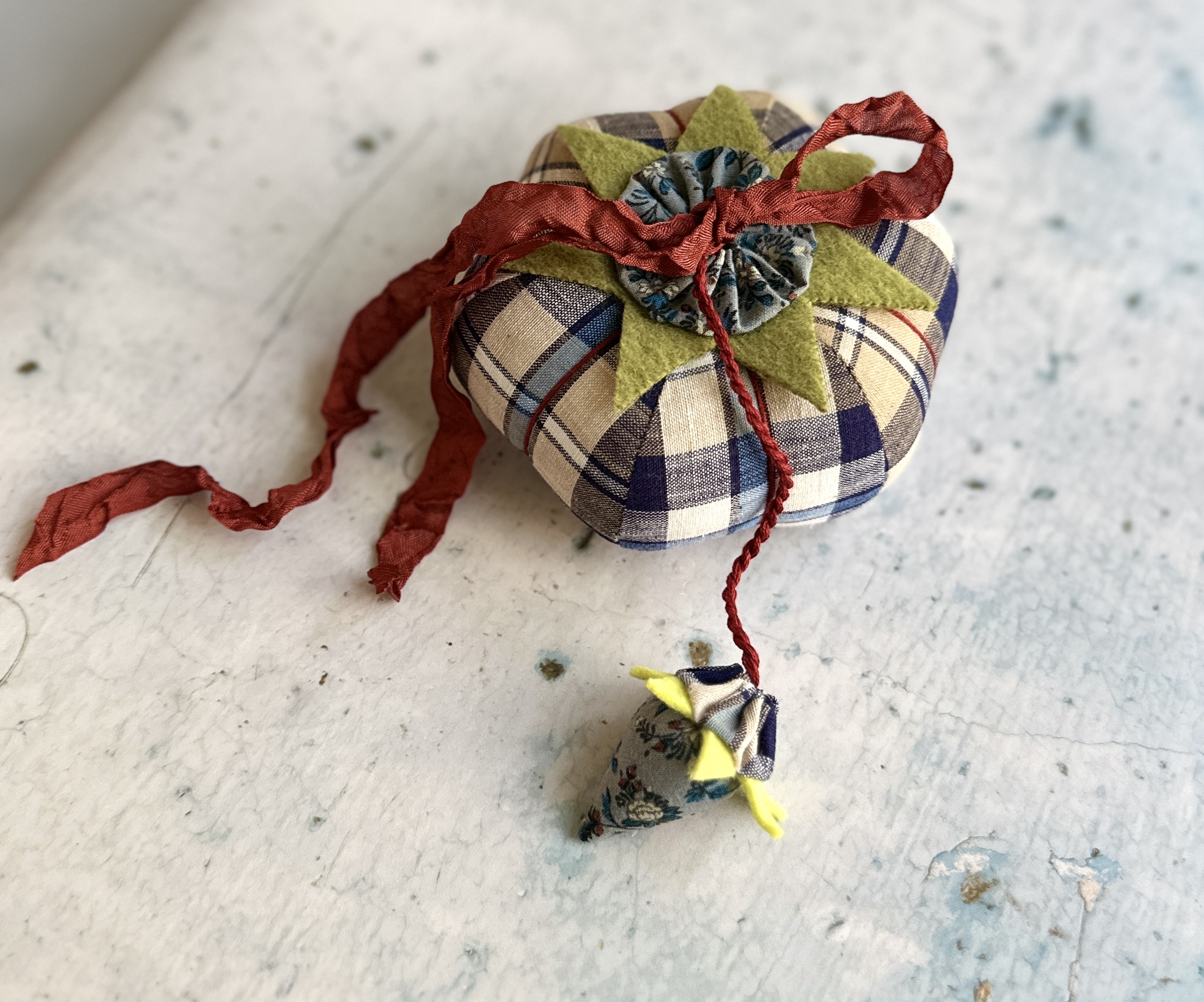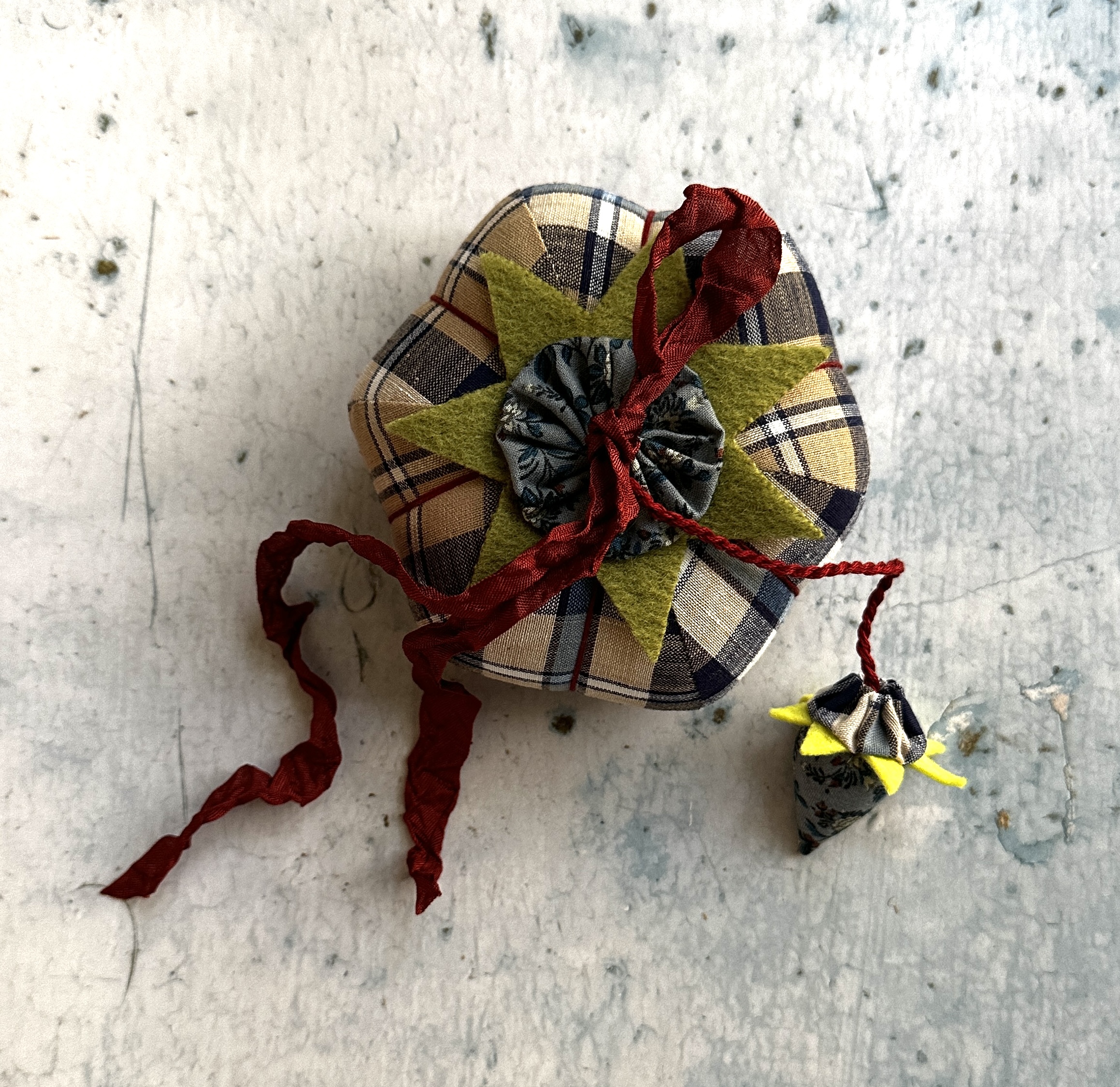 The strawberry & tomato are topped with yo-yos made from vintage Smithsonian fabric, The Rising Sun design and the vintage woven plaid. The top of the tomato is finished with hand-dyed ribbon for an old-fashioned, authentic look.