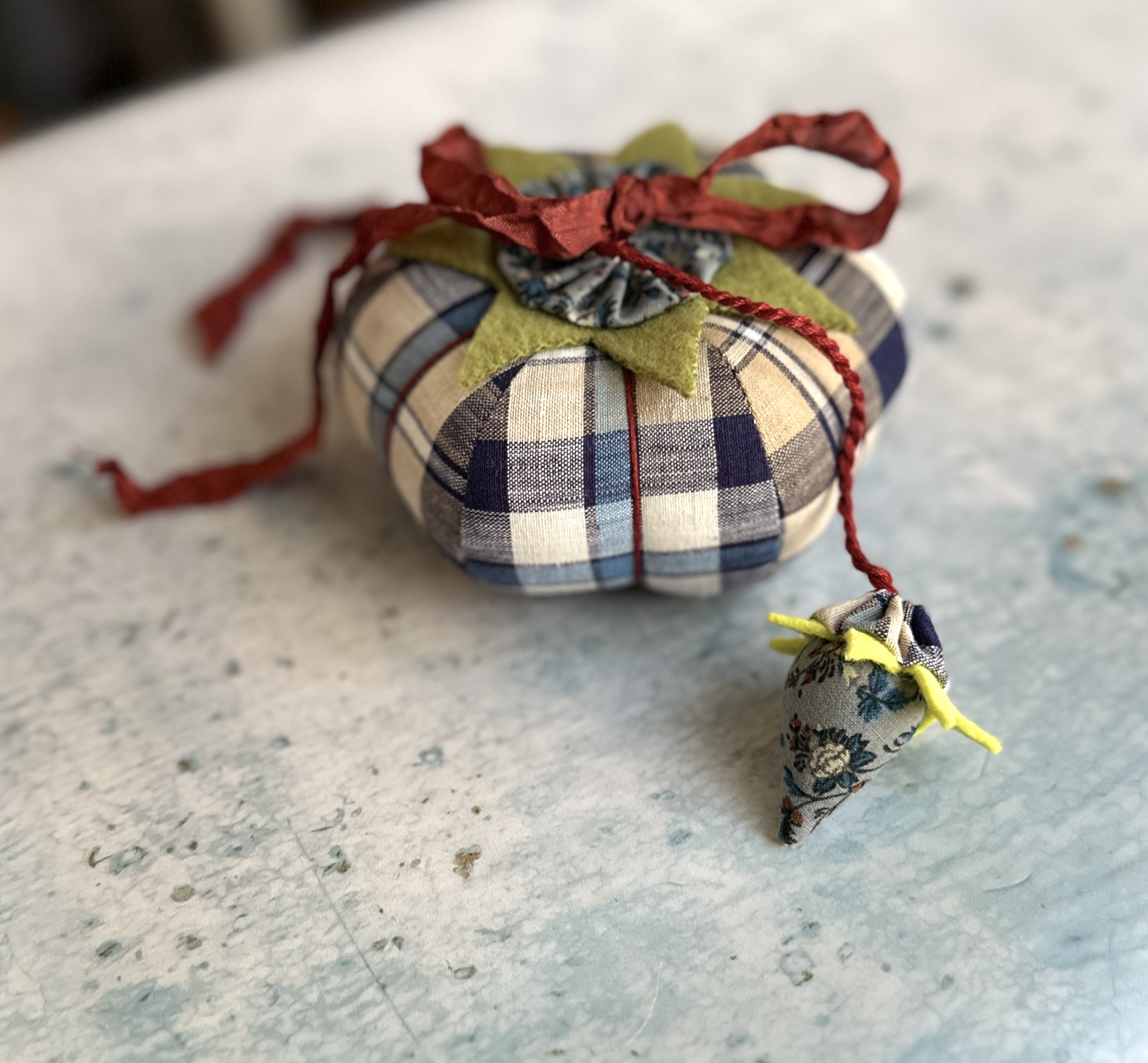 The tomato & strawberry are made from 100% vintage woven plaid in rich, navy, blue and tan tones. The sweet little attached strawberry is filled with emory to keep your needles sharp.
